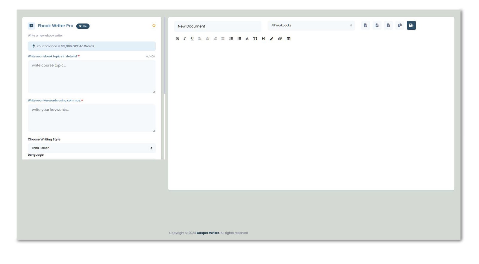 The eBook Writer Pro tool on Casperwriter.ai is designed to make eBook creation smooth and customizable. It allows users to enter detailed topics and specific keywords, ensuring the generated content aligns with their objectives. Users can select from different writing styles, such as third person, and set the preferred language for the eBook. The intuitive workspace on the right side includes a rich text editor for easy formatting and on-the-fly editing, making it ideal for organizing ideas and crafting comprehensive eBooks. This tool is perfect for content creators looking to produce structured, high-quality eBooks with minimal effort.